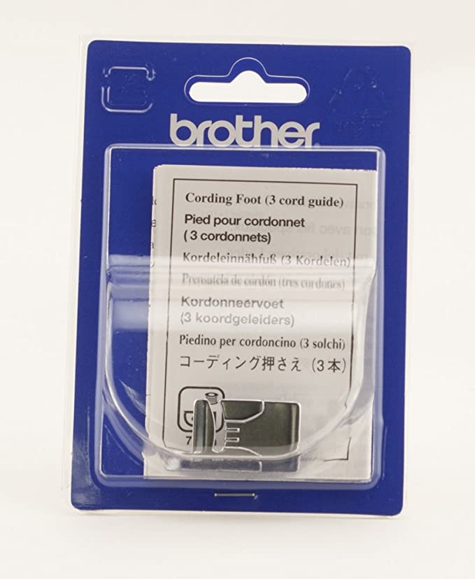 The Brother SA110 Cording Foot is used for embellishing with 1-3 cords. Cords or yarn are held by a clip on the top of the Brother SA110 Cording Foot. Simply insert cords under the clip and stitch down using a serpentine zig zag or other decorative stitch. The Brother SA110 is also great for couching! Similar in use to SA157 & SA158