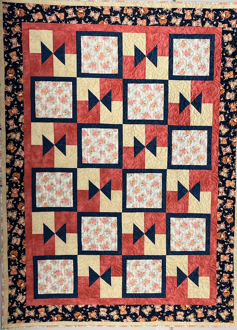 Join us to make this stunning quilt with blocks that will emphasize large prints and easy strips and half square triangles. The large blocks are perfect for fussy cutting. This quilt is slightly larger than our regular 3 Yd. Quilts. It finishes 54” X 72”. Also, we will be using 5 fabrics instead of 3. Cutting and labeling prior to class time is helpful (see page 8 of pattern book).