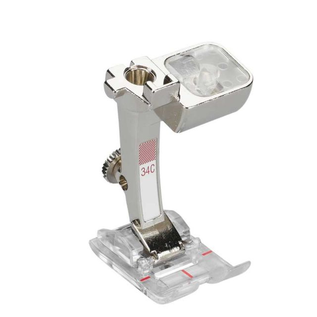 BERNINA Reverse-pattern foot with clear sole #34C affords you a perfect view of the stitching and needle area. The markings on the sole enable you to sew very precisely. For forward and reverse-feed stitches; the clear sole ensures a good view of the sewing area and the red markings allow accurate and careful sewing. Guarantees excellent fabric feed. For 9 mm machines.