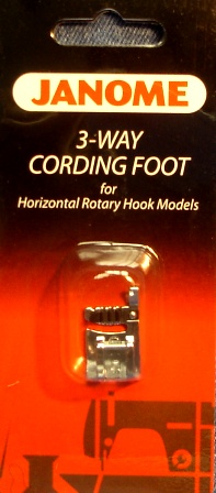 Slots in this foot will hold one to three lengths of cord in place while stitches form over the cords.