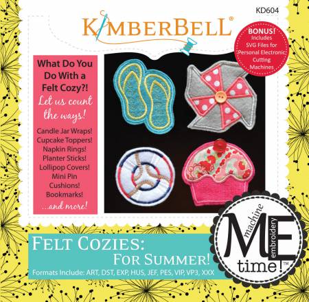 These Summer Felt Cozies are great for adding a bit of color or decoration to a project. The CD includes flip flops, pinwheel, life preserver, and a cupcake as well as some great ideas for what do with them.