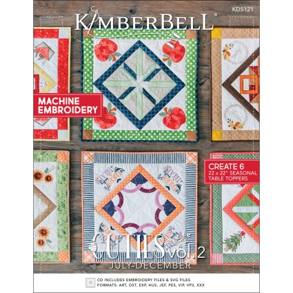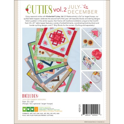 Enjoy seasonal smiles with Kimberbell Cuties, Vol. 2: July – December! Made entirely in-the-hoop of your embroidery machine, Kimberbell’s quilted table toppers celebrate the first half of the year with pieced blocks and darling designs. Each 22″ x 22” table topper features a variety of embellishments, coordinating block-by-block and border quilting designs, and 2” Bitty Blocks for the corners. (Quilting sold separately.) Made in 5″ x 7″ (or larger) hoops, Kimberbell Cuties are a festive way to brighten each day! *Kimberbell products cannot be sold to Amazon, on Amazon, or to unauthorized third-party sellers to resell on Amazon.*