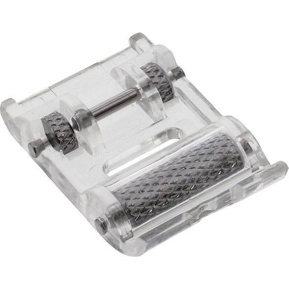 Snap-on roller foot. Offers more control and less friction when sewing on leather, pleather, vinyl, elastic, velvet, silk, and other hard-to-feed materials. Fits virtually any machine that uses snap-on presser feet.