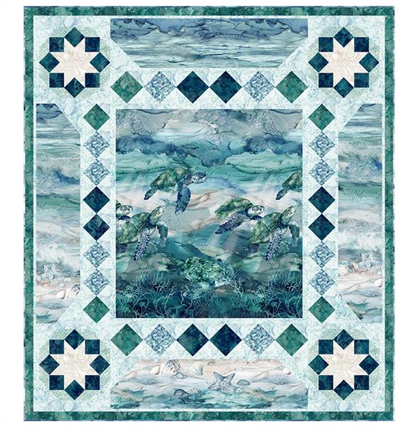 Quick-corner triangles make the on-point units around the large prints and in the corner blocks. The Sea Travelers Pattern is by Sue Harvey & Sandy Boobar of Pine Tree Country Quilts and finishes at 67″ x 75″.